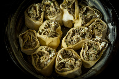 In der Zwischenzeit den Teig aus der Kühlung nehmen und auf einer leicht bemehlten Arbeitsfläche ganz dünn zu einem Rechteck ausrollen. Die Pilz-Feta-Bärlauch-Masse auf ¾ des Teiges gleichmäßig verteilen und anschließend den Teig zu einem Strudel aufrollen. Jeweils ca. 4-5 cm große Krapfen abschneiden und diese in eine gut ausgebutterte Backform schlichten.