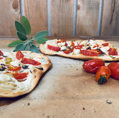 Zuerst mit dem Sauerrahm bestreichen und dann alle Zutaten darauf verteilen. Am Schluss noch mit Olivenöl beträufeln. Im Backrohr ca. 20-25 Minuten backen lassen.